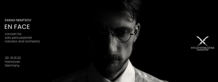 fot. Dominika Wiak SARAH NEMTSOV, EN FACE for solo percussionist, narrator and large orchestra GUSTAV MAHLER, Symphony No. 7 30.01.2022 / 17:0031.01.2022 / 19:30 Staatstheater Hannover Aleksander Wnuk, percussionistFelix Briegel, narratorTitus Engel, conductor Niedersächsisches Staatsorchester Hannover https://staatstheater-hannover.de/de_DE/programm/4-sinfoniekonzert-naehe.1300525